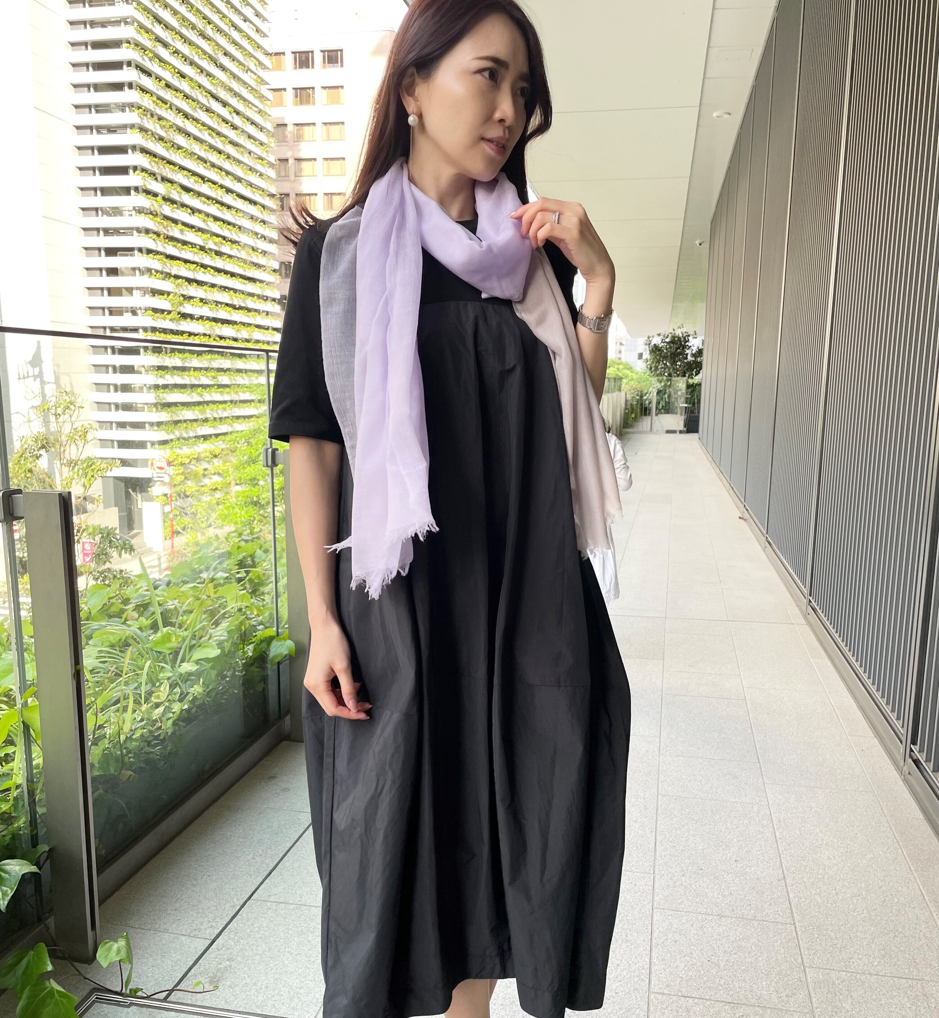 柔らかさ、滑らかさ、軽さを追求して完成したエアリーな風合い。独特のニュアンスを添えるグラデーションカラー、こちらはトレンドのパープルと落ち着いたスモーキーグレーのコンビネーション。素材は夏も涼し気な、極薄素材の細番手のウールを採用し大人の女性も納得の風合いに仕上げました。バックインでも、ストレスのないわずか40gと超軽量なのも嬉しいポイント。オトナの七難、首のシワだってさらりとカバーしてくれる自信作です♩